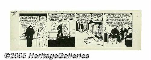 <B>Chester Gould - Dick Tracy Daily Comic Strip Original Art, dated 6-15-44 (Chicago Tribune, 1944)</B></I>. This chilling daily featured one of Dick Tracy's most vicious foes, the Brow. The Brow was ruthless in pursuing his plans and an ominous close-up of his torture device was spotlighted in panel three. Dick Tracy starred in a heated interrogation scene in the final panel. The image area of the daily is 20" x 6" and the art is in Excellent condition. For a <I>Dick Tracy</B></I> art collector, it doesn't get much better than this! <I>From the collection of Larry Doucet.</B></I>