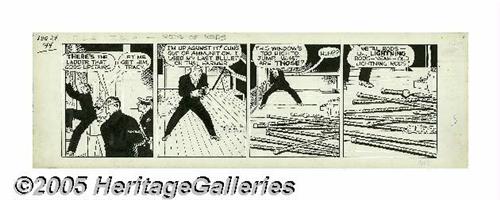 <B>Chester Gould - Dick Tracy Daily Comic Strip Original Art, dated 8-24-44 (Chicago Tribune, 1944).</B></I> The Brow was trapped like a rat and he was out of bullets. Dick Tracy was hot on the trail of the killer and the only things the Brow had to fight Tracy with were old lighting rods -- the stage was being set for Tracy to get speared! The daily has an image area that measures 19.75" x 6" and the art is in Excellent condition. <I>From the collection of Larry Doucet.</B></I>