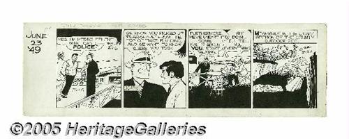 <B>Chester Gould - Dick Tracy Daily Comic Strip Original Art, dated 6-23-49 (Chicago Tribune, 1949).</B></I> In pursuit of Pear-Shape, the police pinch Pedro, who promptly plotzes. Meanwhile, the lions get a feast in the grisly last panel. You could not ask for a more iconic shot of Tracy than the one that graces the second panel, and the strip is filled with Chester Gould's eye-catching design and character work. This one would add spice to any collection. The image area measures 19.75" x 6" and the artwork is in Excellent condition.