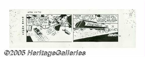 <B>Chester Gould - Dick Tracy Daily Comic Strip Original Art, dated 4-18-70 (Chicago Tribune, 1970).</B></I> Tracy and his pals bear down on the Apparatus gang -- all of whom are making a getaway in one car. This could be the biggest "bag" of all time for the police! Late-era <I>Tracy</B></I> still has all the hallmarks: bold inks, vivid characters, and barreling action, this one setting up a truly explosive situation! The image area measures 16.5" x 5", and the art is in Excellent condition.