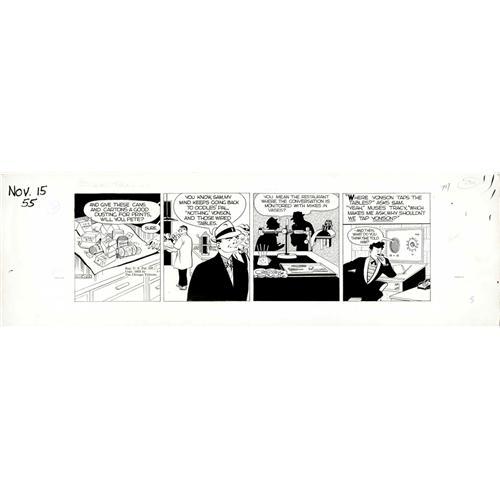 <B>Chester Gould - Dick Tracy Daily Comic Strip Original Art, dated 11-15-55 (Chicago Tribune, 1955).</B></I> Here's a <I>Dick Tracy</B></I> daily about Nothing! "Nothing" Yonson, that is! Tracy and Sam discuss turning the tapped tables on Oodles' pal, in this daily. The image area measures 16.5" x 5" and the condition is Excellent.