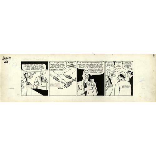 <B>Chester Gould - Dick Tracy Daily Comic Strip Original Art, dated 6-23-56 (The Chicago Tribune, 1956).</B></I> Diet Smith drops in with an updated version of the two-way wrist radio, to the delight of Sam Catchem and Dick Tracy. The improved circuit gives it a range of 2500 miles instead of the original 500. When it premiered in January, 1946 the wrist radio was an instant success, giving the Tracy crimefighting team yet another tool to improve the odds. This strip marks the tenth anniversary of the famed invention. The art measures 16.5" x 5" and is in Excellent condition. <I>From the collection of Larry Doucet.</B></I>