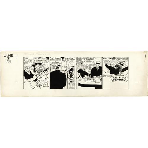 <B>Chester Gould - Dick Tracy Daily Comic Strip Original Art, dated 6-3-54 (Chicago Tribune, 1954).</B></I> Open-Mind Monty's game of possum ends when Dick Tracy soaks him with a towel filled with ice -- a lighthearted moment for the boys in blue! Expressive linework and snappy patterns in the art add to the overall sense of fun. The daily has an image area of 16.5" x 5", and the art is in Excellent condition. <I>From the collection of Larry Doucet.</B></I>