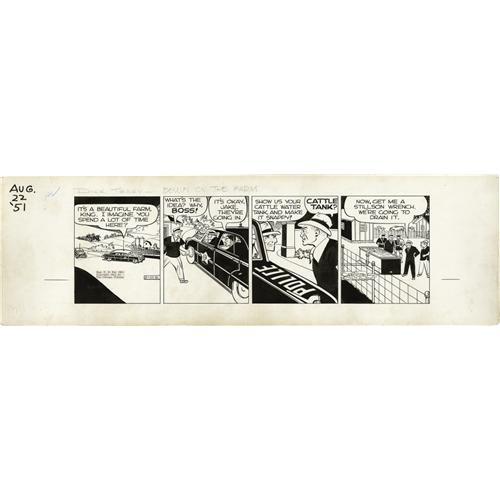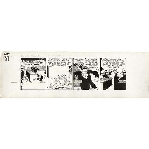 <B>Chester Gould - Dick Tracy Daily Comic Strip Original Art, Group of 2 (Chicago Tribune, 1951).</B></I> Following a trial blazed by Senator Estes Kefauver's televised hearings on Organized Crime (the Special Committee to Investigate Crime in Interstate Commerce, May, 1950-May, 1951), Dick Tracy tackled the menace of the Crime Syndicate and its King in the newspaper comics. These two consecutive dailies, dated 8-22 and 8-23-51, showcase Tracy at his best, as he hones in on an end to the King. Each daily has a 16.5" x 5" image area, and the strips are in Excellent condition.