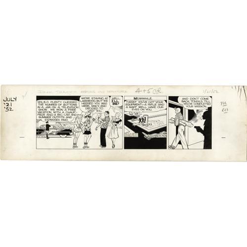 <B>Chester Gould - Dick Tracy Daily Comic Strip Original Art dated 7-21-52 (Chicago Tribune, 1952).</B></I> The Dick Tracy and B.O. Plenty families enjoy a vacation visit, blissfully unaware of the murderous plans of Tonsils. Dick looks very relaxed in his Hawaiian shirt. The daily has an image area that measures 16.5" x 5" and the art is in Excellent condition. <I>From the collection of Larry Doucet.</B></I>