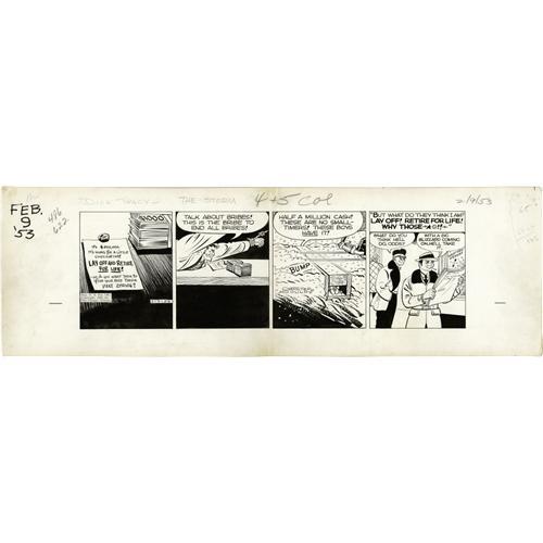 <B>Chester Gould - Dick Tracy Daily Comic Strip Original Art, dated 2-9-53 (Chicago Tribune, 1953).</B></I> Dick Tracy has been catching crooks for over 70 years, so you can imagine what he thought of Odds Zonn's attempted bribe of a half-million dollars! As soon as Tracy escaped his frigid death trap, he was certain to throw that blood money into an evidence box! The daily has an image area that measures 16.5" x 5" and the art is in Excellent condition. <I>From the collection of Larry Doucet.</B></I>