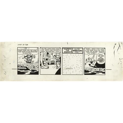 <B>Chester Gould - Dick Tracy Daily Comic Strip Original Art, dated 6-13-68 (Chicago Tribune, 1968).</B></I> Crime doesn't pay -- especially when Dick Tracy is armed with a magnetic Space Coupe and a laser beam! No one drew a more compelling strip than Chester Gould! The image area measures 16.5" x 5" and the art is in Excellent condition. <I>From the collection of Larry Doucet.</B></I>