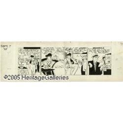 <B>Chester Gould - Dick Tracy Daily Comic Strip Original Art, dated 9-7-55 (Chicago Tribune, 1955).</B></I> The gargantuan Oodles explains the finer points of extortion to his iniquitous associates in this portly, four paneled page by Chester Gould. Meanwhile, Dick Tracy and Sam put a little grease on the wheels of justice. This solid strip is gorged with life - it's Gould at his best! The image area measures 5" x 16.5" and the art is in Excellent condition. <I>From the collection of Larry Doucet.</B></I>