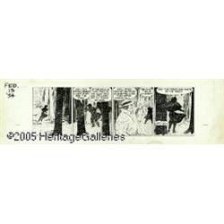 <B>Chester Gould - Dick Tracy Daily Comic Strip, dated 2-13-54 Original Art (The Chicago Tribune, 1954).</B></I> Br-r-r! This is murder! A classic Chester Gould-rendered snow scene and Tracy's 2-way wrist radio highlight this daily. The image area measures 16.5" x 5". The strip is in Excellent condition, with moderate soiling around the page borders (the image area is unaffected). <I>From the collection of Larry Doucet.</B></I>