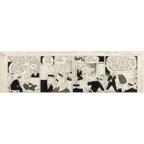 <B>Chester Gould - Dick Tracy Daily Comic Strip Original Art, dated 9-22-33 (Chicago Tribune, 1933).</B></I> With the help of a bespectacled doctor, Dick Tracy injects "truth serum" into Slicer in an attempt to crack an auto theft ring. Those were heady "pre-Miranda warning" days for lawmen. This daily was originally given away in 1933 to the fellers of the Hoboken YMCA, as Chester Gould's handwritten notation at the upper right attests. The episode stars Dick Tracy and Pat Patton. Strips before 1940 are rarely offered for sale -- an example signed by Gould is even more special. This daily has an image area of 20" x 5.5", and the art is in Excellent condition.<BR><BR><b>Shipping:</b> Framed - with Glass, Medium (<a target="_blank" href="http://www.heritageauctions.com/common/shipping.php">view shipping information</a>)