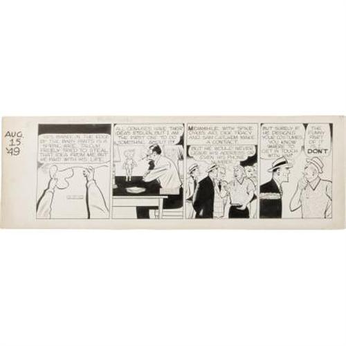 <B>Chester Gould - Dick Tracy Daily Comic Strip Original Art, dated 8-15-49 (Chicago Tribune, 1949). </B></I> The psychopath, Sketch Peree, boasts freely to his girl doll, Babee, even while Dick Tracy and Sam Catchem close in on the trail of this demented desperado. The forties produced some of Dick Tracy's greatest villains, but no matter how clever they were, Tracy always tracked them down. This daily has an image area of 20" x 6", and the art is in Excellent condition.<BR><BR><b>Shipping:</b> Flat Material, Small (<a target="_blank" href="http://www.heritageauctions.com/common/shipping.php">view shipping information</a>)