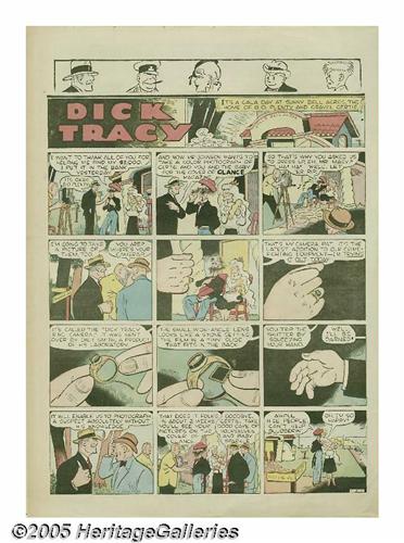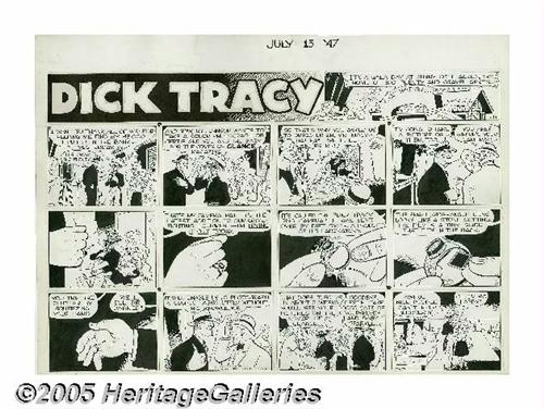 <B>Chester Gould - Dick Tracy Sunday Comic Strip Original Art, dated 7-13-47 (Chicago Tribune, 1947).</B></I> Once again, Dick Tracy proved he had the Sharper Image on crimefighting with his new gimmick, the "Dick Tracy ring-camera!" Chester Gould filled his feature with a panoply of hi-tech gadgets, goodies such as the two-way wrist radio, the space coupe, and the atomic light. In this charming Sunday, Dick used his new toy to take a group portrait of B.O.Plenty and Gravel Gertie with their newborn baby, Sparkle Plenty. The image area of the strip is 27" x 18". Each panel of the Sunday was glued to a larger support page; otherwise the art is in Excellent condition. A tear sheet of the strip, printed in a tabloid format is included in this lot.<I>From the collection of Larry Doucet.</B></I>