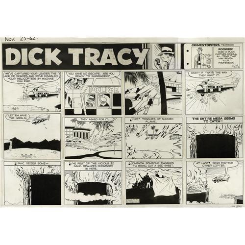 <B>Chester Gould - Dick Tracy Sunday Comic Strip Original Art, dated 11-25-62 (Chicago Tribune, 1962).</B></I> Talk about crimestoppers -- Dick Tracy dropped a payload of napalm on the vicious Fifty-two gang when they fired at his helicopter! To paraphrase Lt. Bill Kilgore from "Apocalypse Now," Dick loved the smell of napalm in the morning. It smelled like -- victory! Dick Tracy makes Dirty Harry look like a wimp in this Sunday. Check out the baddies jumping to their deaths in panel nine -- chilling! The image area of the strip is 27" x 18". Each panel of the Sunday was glued to a larger support page; otherwise the art is in Excellent condition. <I>From the collection of Larry Doucet</B></I>.