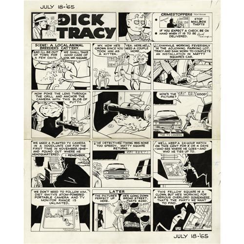 <B>Chester Gould - Dick Tracy Sunday Comic Strip Original Art, dated 7-18-65 (Chicago Tribune, 1965).</B></I> Inventor Diet Smith provided Dick Tracy with the perfect surveillance set-up in this crimestopping masterpiece. Matty Square and his cigar-smoking cat co-star with Dick Tracy, Sam Catchem, and Lizz. The page was cut horizontally between panel tiers three and four and then rejoined using tape on the back of the paper; otherwise the art is in Excellent condition