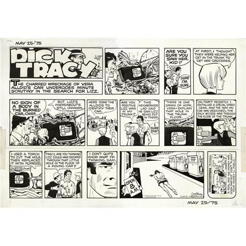 <B>Chester Gould - Dick Tracy Sunday Comic Strip Original Art, dated 5-25-75 (Chicago Tribune, 1975).</B></I> The charred wreckage of Vera Alldid's car undergoes minute scrutiny by Dick Tracy and his men in their search for the kidnapped Lizz. A disheveled Dick Tracy oversees the effort, and the final eerie frame of Lizz laying alone in a pool of blood at an empty gas station will haunt you. Chester Gould's penchant for gritty, violent realism is showcased here in full force. The art has an image area of 22" x 14.5" and the strip has its original logo paste-up. The art is in Excellent condition. <I>From the collection of Larry Doucet.</B></I>