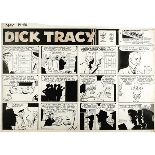 <B>Chester Gould - Dick Tracy Sunday Comic Strip Original Art, dated 5-14-61 (Chicago Tribune, 1961).</B></I> Chester Gould's storytelling was hallmarked by its hard-edged, diagrammatical clarity. Dick Tracy demonstrates his science-based crime-solving technique as he hones the search for an animal bandit. The image area of this strip is 27" x 18". Each panel of the Sunday was glued to a larger support paper; otherwise, the condition of the art is Very Good.<BR><BR><b>Shipping:</b> Large Flat (<a target="_blank" href="http://www.heritageauctions.com/common/shipping.php">view shipping information</a>)