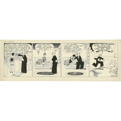 <B>Chester Gould - Kid Casey Try-Out Daily Comic Strip Original Art (circa 1925).</B></I> Before he created <I>Dick Tracy</B></I>, the hard-working Chester Gould tried his hand at many strips. After studying the lessons of W.L. Evans' mail-order cartooning course, Gould left Oklahoma to pursue his cartooning career in Chicago. Gould started out with gag strips such as <I>Fillum Fables</B></I>, <I>Radio Cats</B></I>, and <I>The Girl Friends</B></I>. Kid Casey lends his soft shoulder to comfort Jean on -- after he "loses" her dogs -- the cad! This daily has an image area of 20" x 6", and the art is in Excellent condition.