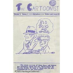 <B>Chester Gould - The Cartoonist #1 Cover Original Art (undated).</B></I> "H'lo boys and girls". Chester Gould drew this specialty drawing of Dick Tracy and Junior Tracy for the cover of the first issue of <B>The Cartoonist</B></I>. The original colored pencil drawing measures 5" x 4.4" and was mounted onto a sheet of 5.5" x 8.5" paper. There is some slight aging, otherwise this work is in Excellent condition. Signed by Chester Gould. <I>From the collection of Larry Doucet.</B></I>