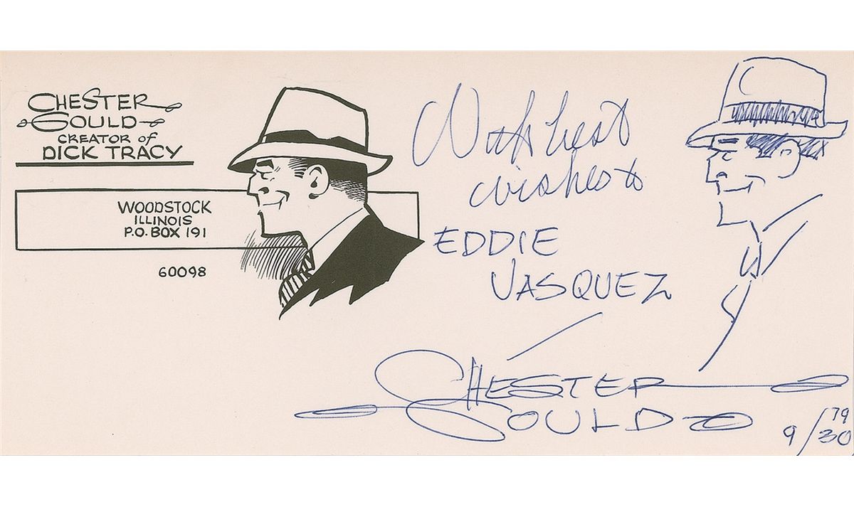 Original signed and inscribed ballpoint sketch of Dick Tracy in profile on an off-white 7.25 x 3.5 card, signed and inscribed “With best wishes to Eddie Vasquez, Chester Gould 9/30/79.” In fine condition.