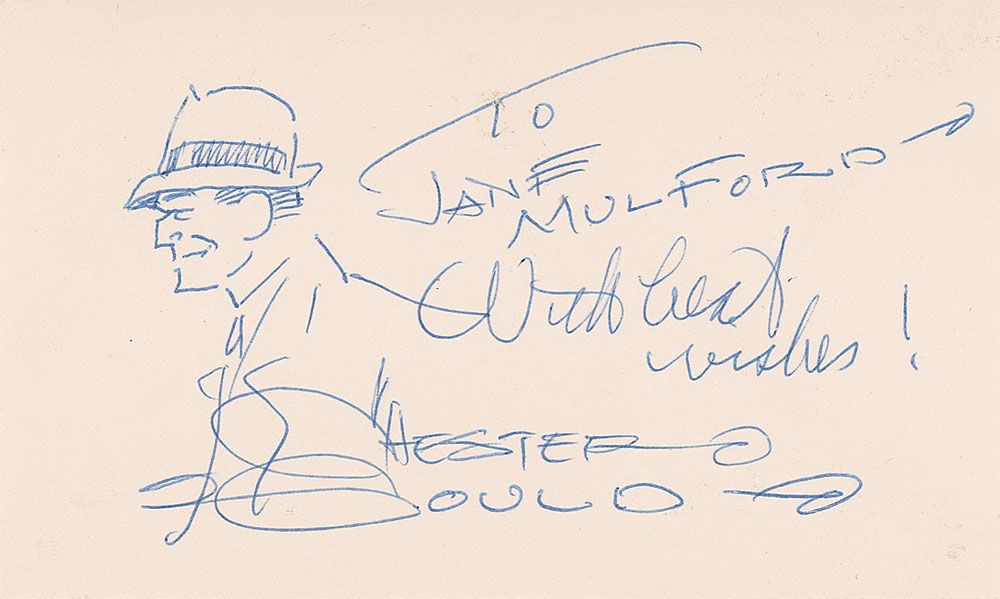 Original ballpoint sketch of Dick Tracy in profile on an off-white 5 x 3 card, signed and inscribed, “To Jane Mulford—With best wishes, Chester Gould.” In fine condition.