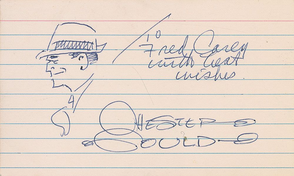 Original signed and inscribed ballpoint sketch of Dick Tracy on an off-white 5 x 3 lightly-lined card, signed and inscribed “To Fred Carey, with best wishes, Chester Gould.” In fine condition.