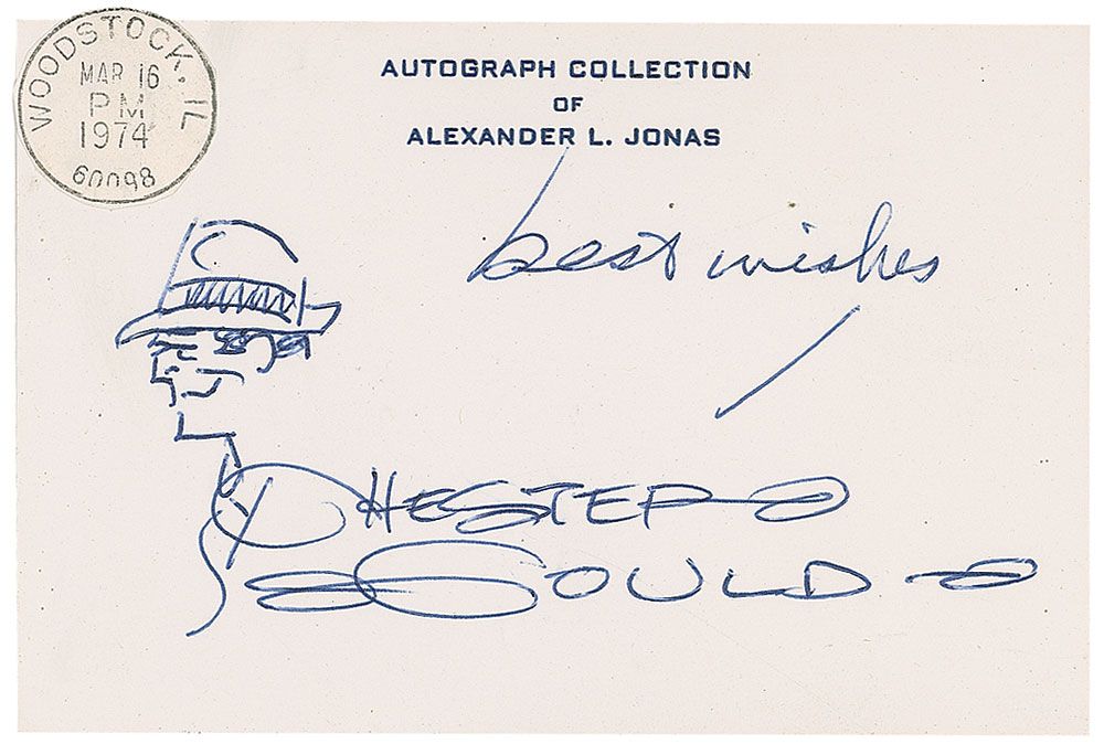 Original ballpoint sketch of Dick Tracy in profile on a white 4.5 x 3 custom-made collector’s card, signed, “Best wishes, Chester Gould,” with a clipped March 16, 1974, Woodstock, Illinois, postmark affixed to upper left corner. In fine condition, with mounting remnants to reverse from previous display in a scrapbook.