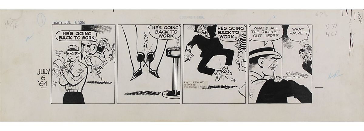 Original hand-inked four-panel Dick Tracy comic strip, dated July 6, 1964, on a 23 x 7 piece of off-white artist’s cardstock. First panel features Tracy using his legendary two-way wrist TV, and is signed in the last panel in black ink by Gould. In very good condition, with a faint central vertical bend, some scattered light toning, and ink and pencil notations to borders.