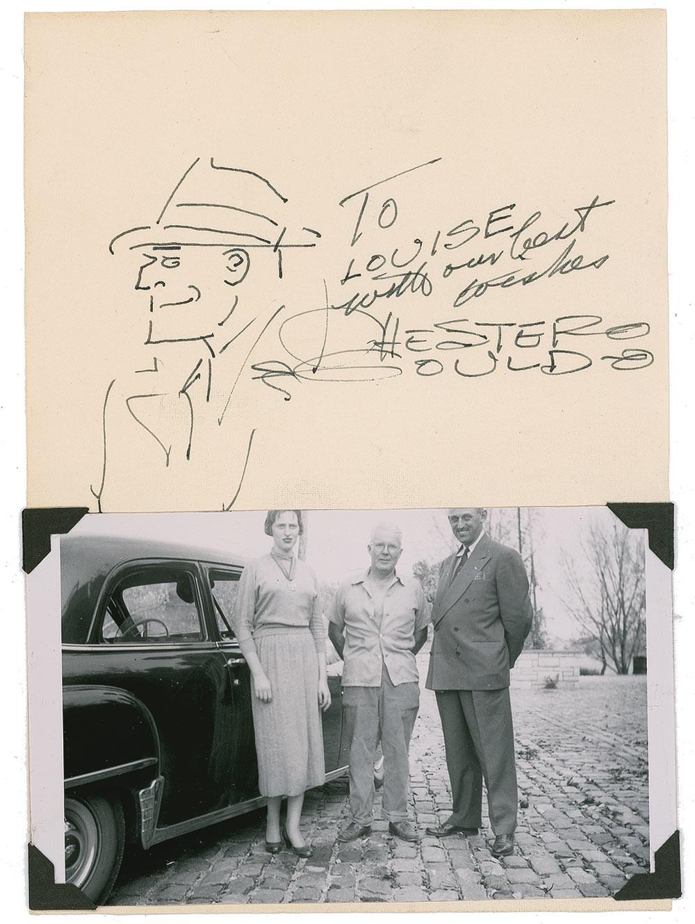 Original signed and inscribed ink sketch of Dick Tracy on an off-white 5 x 7 sheet, signed and inscribed “To Louise, with our best wishes, Chester Gould.” An original unsigned candid portrait of Gould and the sketch’s recipient is affixed to the bottom of the sheet. In fine condition. RRAuction COA.