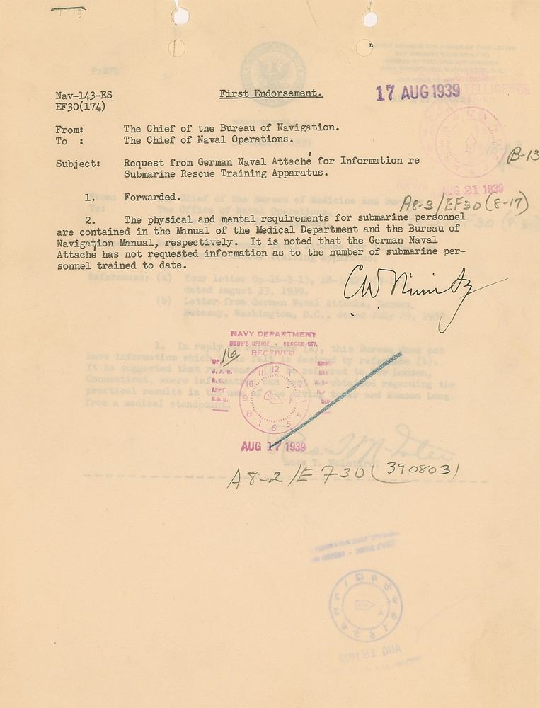 DS, signed "C. W. Nimitz," one page, 8 x 10.5, August 17, 1939. Document endorsing a "request from German Naval Attache for Information re Submarine Rescue Training Apparatus," in part: "The physical and mental requirements for submarine personnel are contained in the Manual of the Medical Department and the Bureau of Navigation Manual, respectively. It is noted that the German Naval Attache has not requested information as to the number of submarine personnel trained to date." Attached is a letter signed by Ross T. McIntyre, referring to the request to New London, Connecticut. In very good to fine condition, with light creasing, and file holes to the top edge.