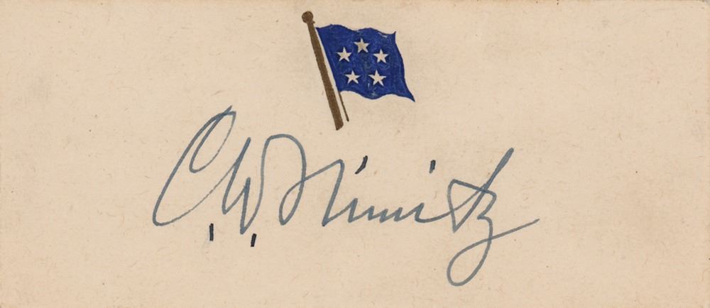 Vintage fountain pen signature, "C. W. Nimitz," on an off-white 4 x 1.75 card imprinted with the flag of the fleet admiral. In fine condition.