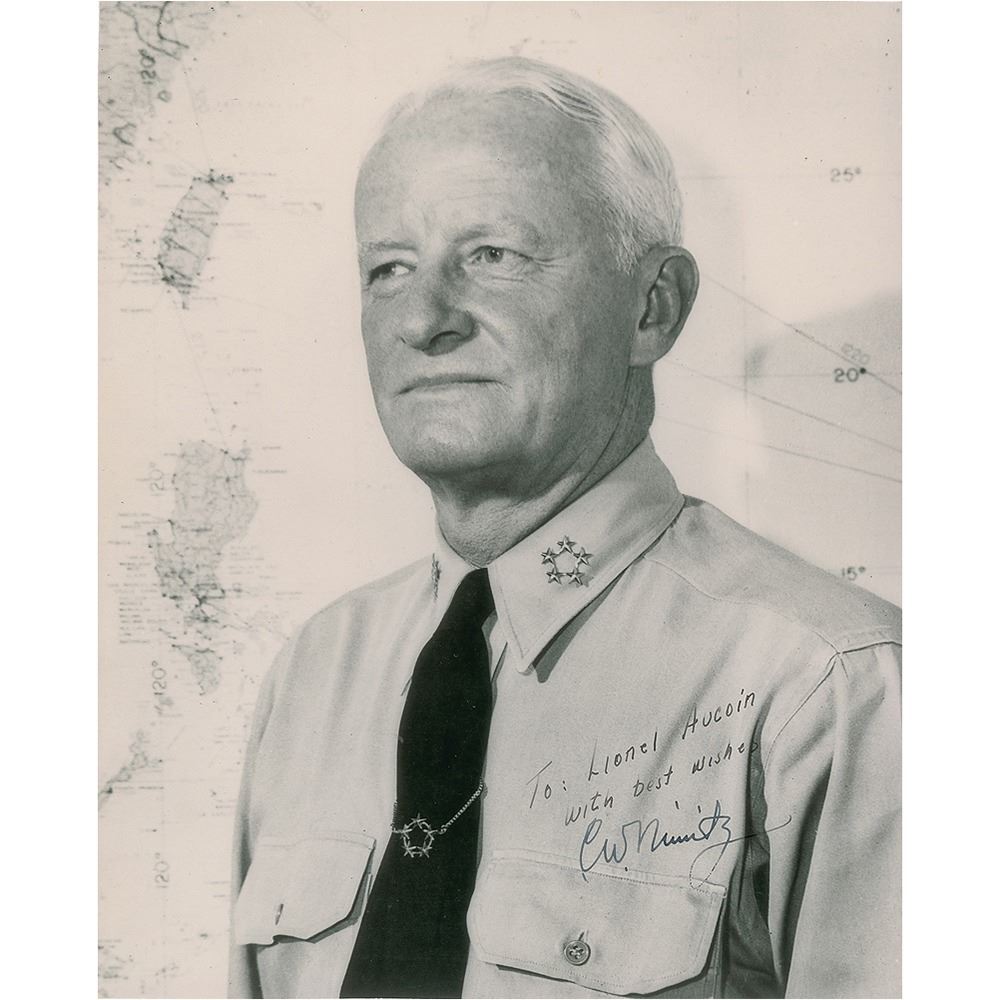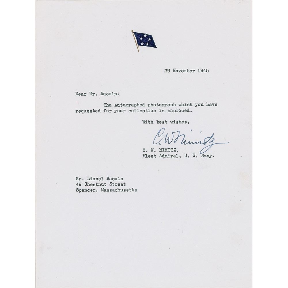 Two items: a vintage matte-finish 8 x 10 photo of Fleet Admiral Nimitz posing in front of a large map, signed and inscribed in fountain pen, "To: Lionel Aucoin, with best wishes, C. W. Nimitz"; and a TLS signed "C. W. Nimitz," one page, 6.5 x 8.75, Fleet Admiral letterhead, November 29, 1945, in full: "The autographed photograph which you have requested for your collection is enclosed." In overall fine condition.