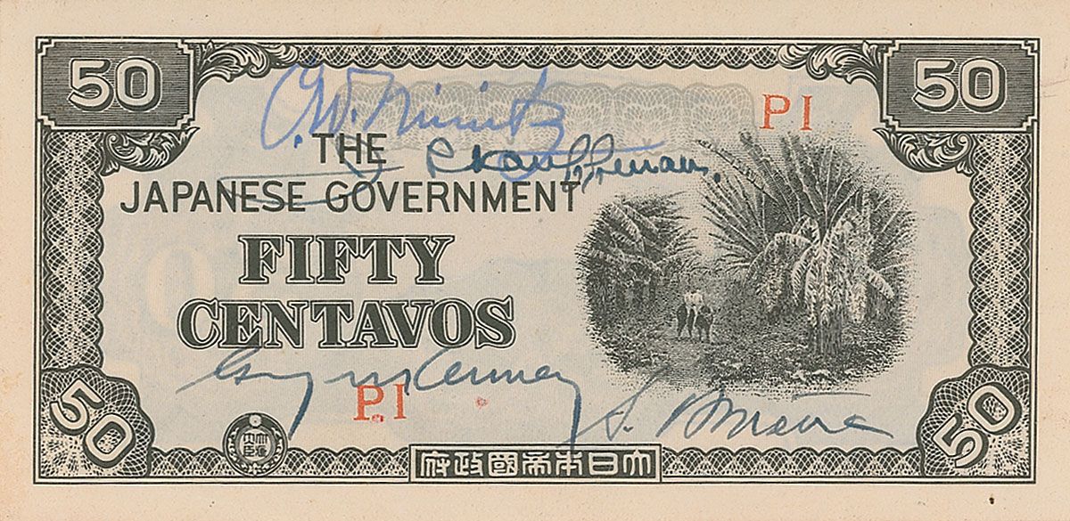 Japanese government fifty centavo banknote, signed on the front in fountain pen by Chester Nimitz, J. R. Kauffman, and two others. In fine condition.