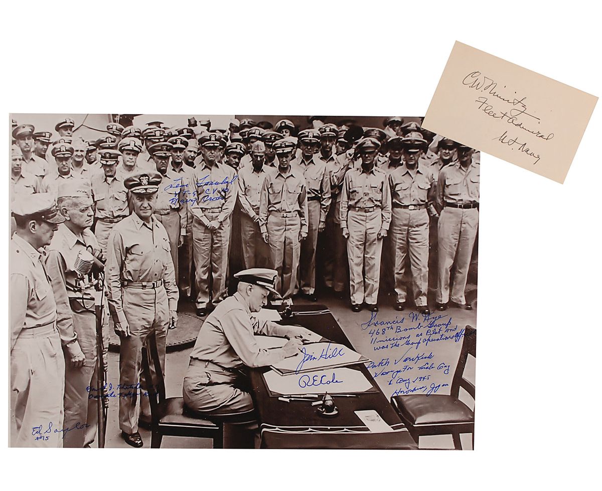 Two items: vintage ink signature, “C. W. Nimitz, Fleet Admiral, U. S. Navy,” on an off-white 5 x 3 card; and a 15.5 x 10 cardstock photo of Nimitz signing the Japanese surrender, signed in blue felt tip by Leon Frankel, David Thatcher, Ed Saylor, Jim Hill, R. E. Cole, Francis W. Nye, and Dutch Van Kirk. In fine condition.
