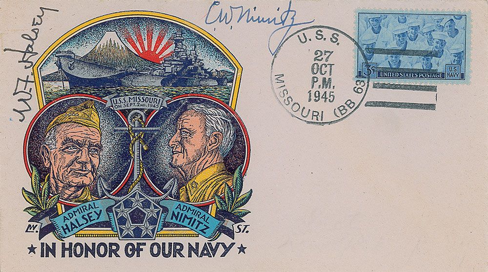 Commemorative cover with a cachet honoring Nimitz, Halsey, and the USS Missouri, signed in blue ink, “C. W. Nimitz,” and in black ink, “W. F. Halsey.” Cover also bears an October 27, 1945, USS Missouri postal cancellation. In fine condition.