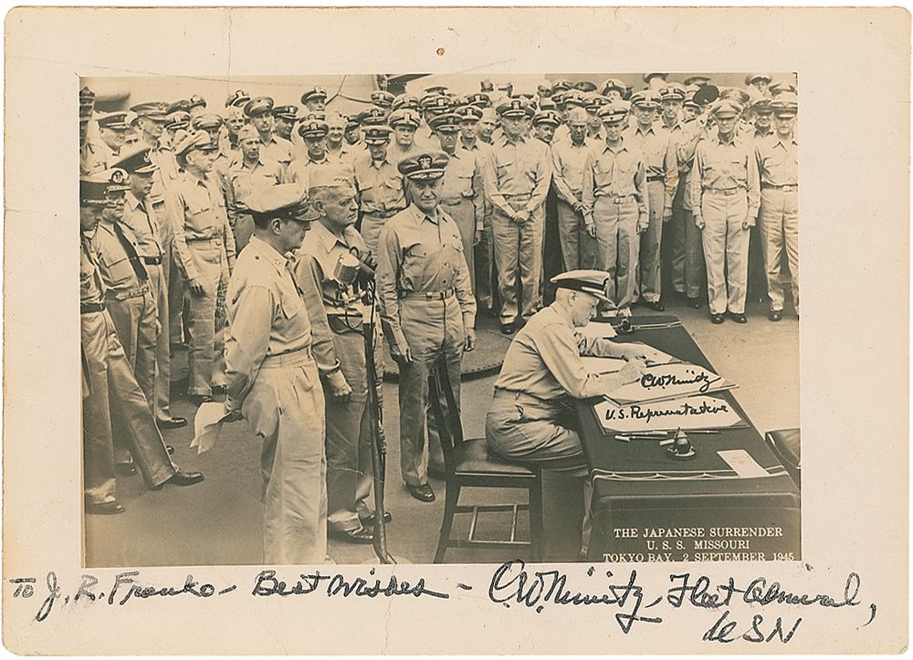Historic vintage matte-finish 7 x 5 photo of Nimitz signing the Japanese surrender aboard the USS Missouri, signed and inscribed in the lower border in black ink “To J. R. Franks—Best wishes—C. W. Nimitz, Fleet Admiral, USN.” Scattered creases, some irregular ink adhesion to inscription, a few light brushes to signature, some scattered mild silvering, and a tack hole to top border, otherwise very good condition.