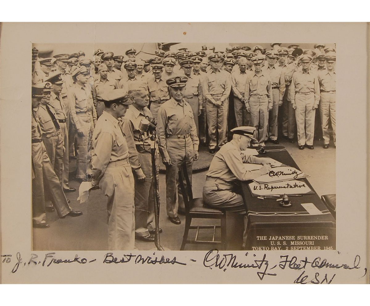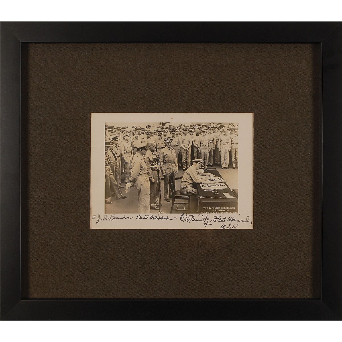 Vintage matte-finish 6.5 x 4.75 photo of Nimitz signing the Japanese surrender aboard the USS Missouri, signed and inscribed in the lower border in fountain pen “To J. R. Franks—Best wishes—C. W. Nimitz, Fleet Admiral, USN.” Cloth-matted and framed to an overall size of 14 x 12.25. In very good condition, with scattered creases, a couple light brushes to inscription and rank, a tack hole to top border, and a bit of light silvering.