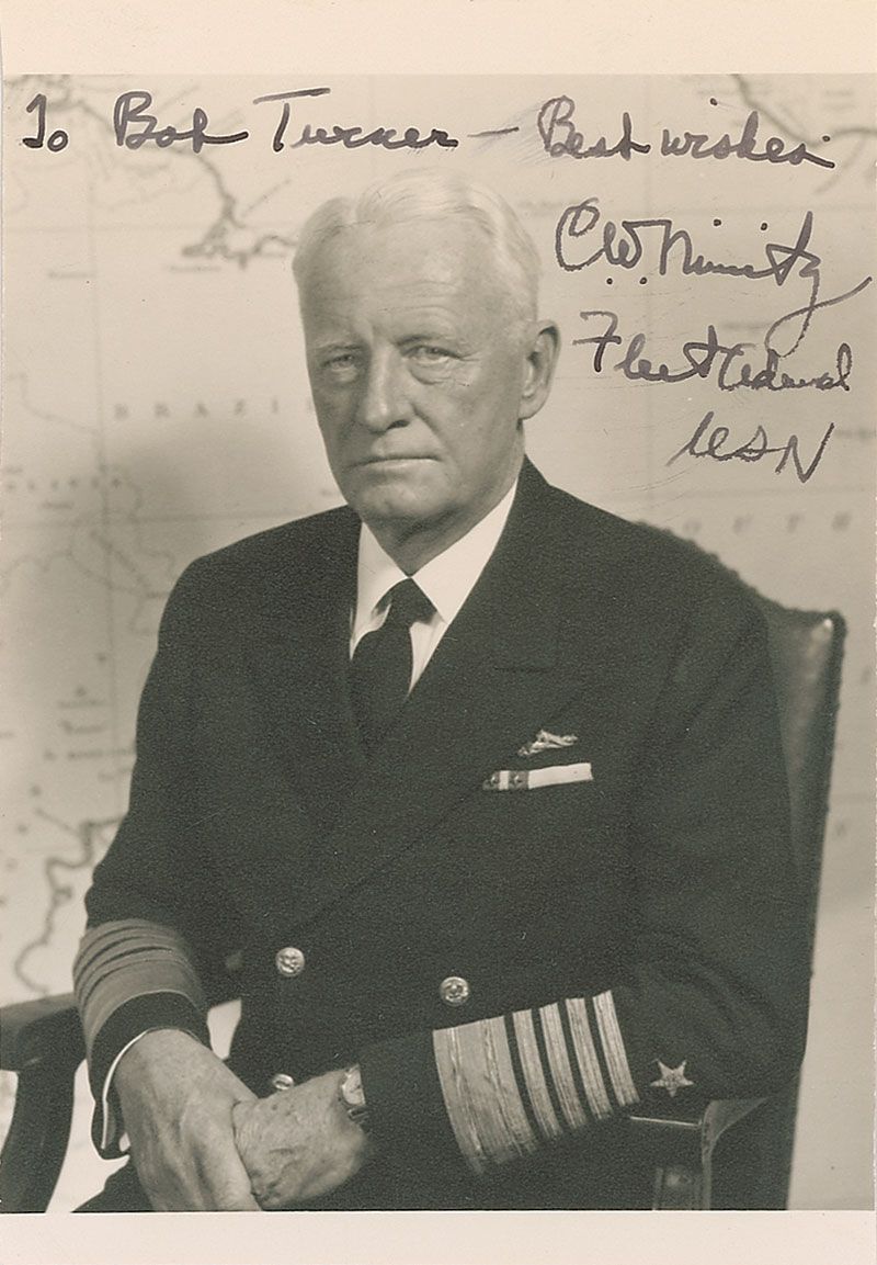 Two items: one vintage matte-finish 3.5 x 5 photo of Nimitz in uniform, signed and inscribed in fountain pen, “To Bob Turner—Best wishes, C. W. Nimitz, Fleet Admiral USN”; and one fountain pen signature, “C. W. Nimitz, Fleet Admiral, U. S. Navy,” on an off-white 4 x 2.5 card. In overall fine condition, with trimmed edges to the photo.