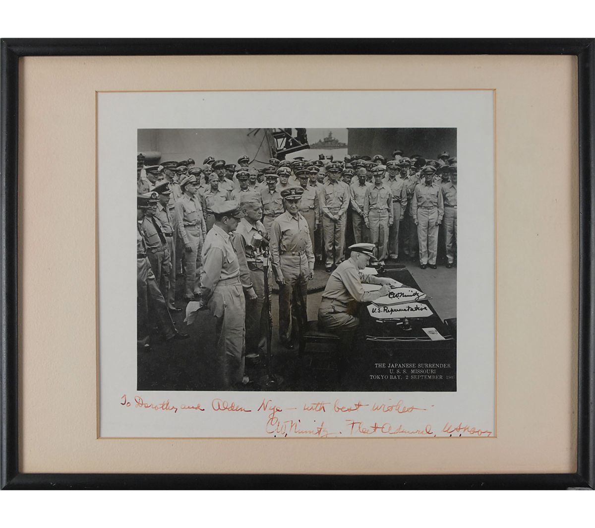 Vintage matte-finish 11 x 9.5 photo of Nimitz signing the Japanese surrender aboard the USS Missouri, signed and inscribed in the lower border in brown fountain pen “To Dorothy and Alden Nye—with best wishes, C. W. Nimitz, Fleet Admiral, U.S. Navy.” Photo also bears a pre-printed signature next to Nimitz’s image. Matted and framed to an overall size of 16.5 x 12.75. In fine condition, with a bit of light irregular ink adhesion to the signature, which remains perfectly legible.