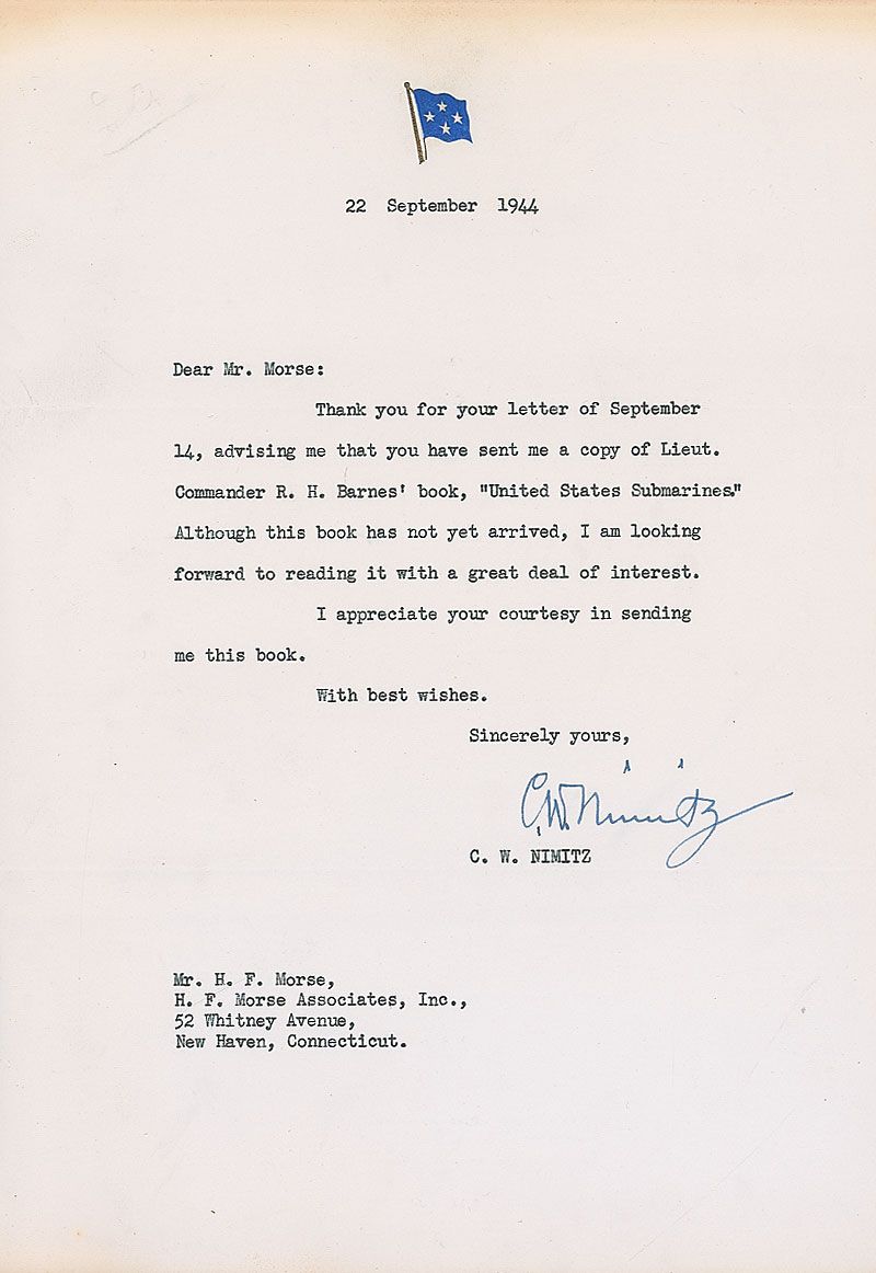 TLS signed “C. W. Nimitz,” one page, 7.25 x 10.25, personal embossed letterhead, September 22, 1944. Letter to H. F. Morse. In part: “Thank you for your letter…advising me you have sent me a copy of…‘United States Submarines.’…I am looking forward to reading it with a great deal of interest.” In fine condition, with some mild edge toning.