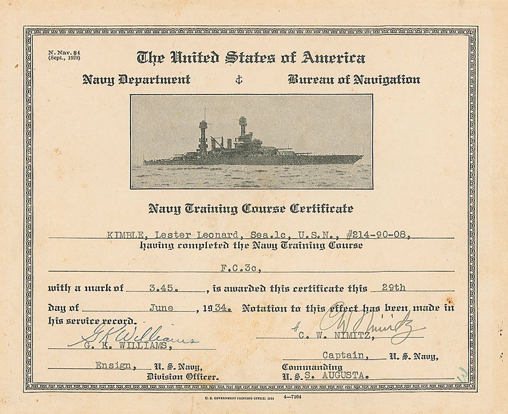 DS, signed “C. W. Nimitz,” one page, 8.5 x 7, June 29, 1934. Navy Training Course Certificate issued to Lester Leonard Kimble, Seaman 1st Class, stating he has completed the Navy Training Course, “F.C.3c, with a mark of 3.45…Notation to this effect has been made in his service record.” Signed at the conclusion by Nimitz and countersigned by Ensign G. K. Williams. Some scattered light foxing and tape remnants to reverse edges, otherwise fine condition.