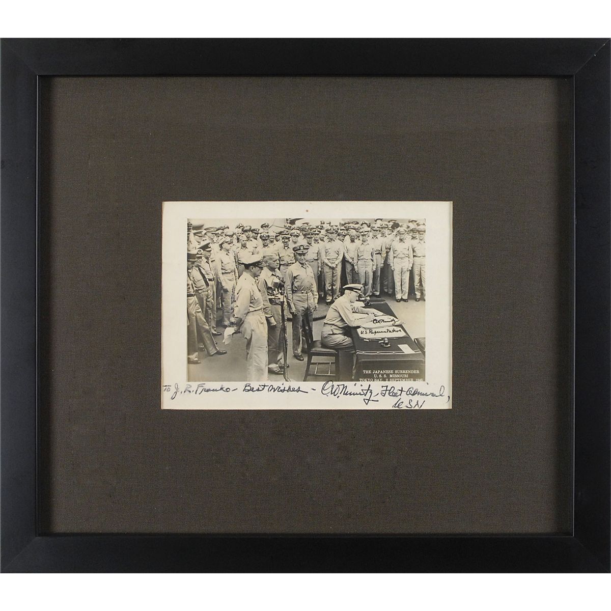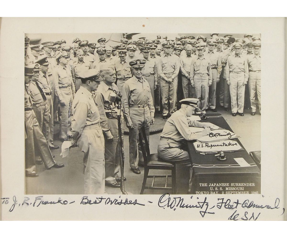 Vintage matte-finish 6.5 x 5 photo of Nimitz signing the Japanese surrender aboard the USS Missouri, signed and inscribed in black ink, “To J. R. Franko—Best wishes—C. W. Nimitz—Fleet Admiral, USN.” Matted and framed to an overall size of 14 x 12.25. In very good condition, with scattered creases, a couple light brushes to signature and inscription, and a bit of mild silvering to darker areas.