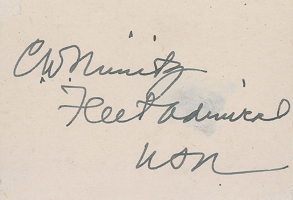Vintage ink signature, “C. W. Nimitz, Fleet Admiral, USN,” on an off-white 3.75 x 2 slip affixed to an identical size slip. In fine condition, with Dymo label remnants to vertical edges and slight show-through from adhesive on reverse.