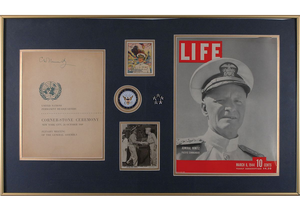 Vintage program cover from the United Nations Corner-Stone Ceremony, held in New York on October 24, 1949, 8 x 10.5, signed at the top in blue ink, “C. W. Nimitz.” Double-matted and framed with a Life magazine cover, two other images of Nimitz, a Navy medallion and five-star cluster to an overall size of 30.25 x 18.25. In fine condition, with a uniform shade of mild toning, and some light dampstaining along bottom edge. Oversized.