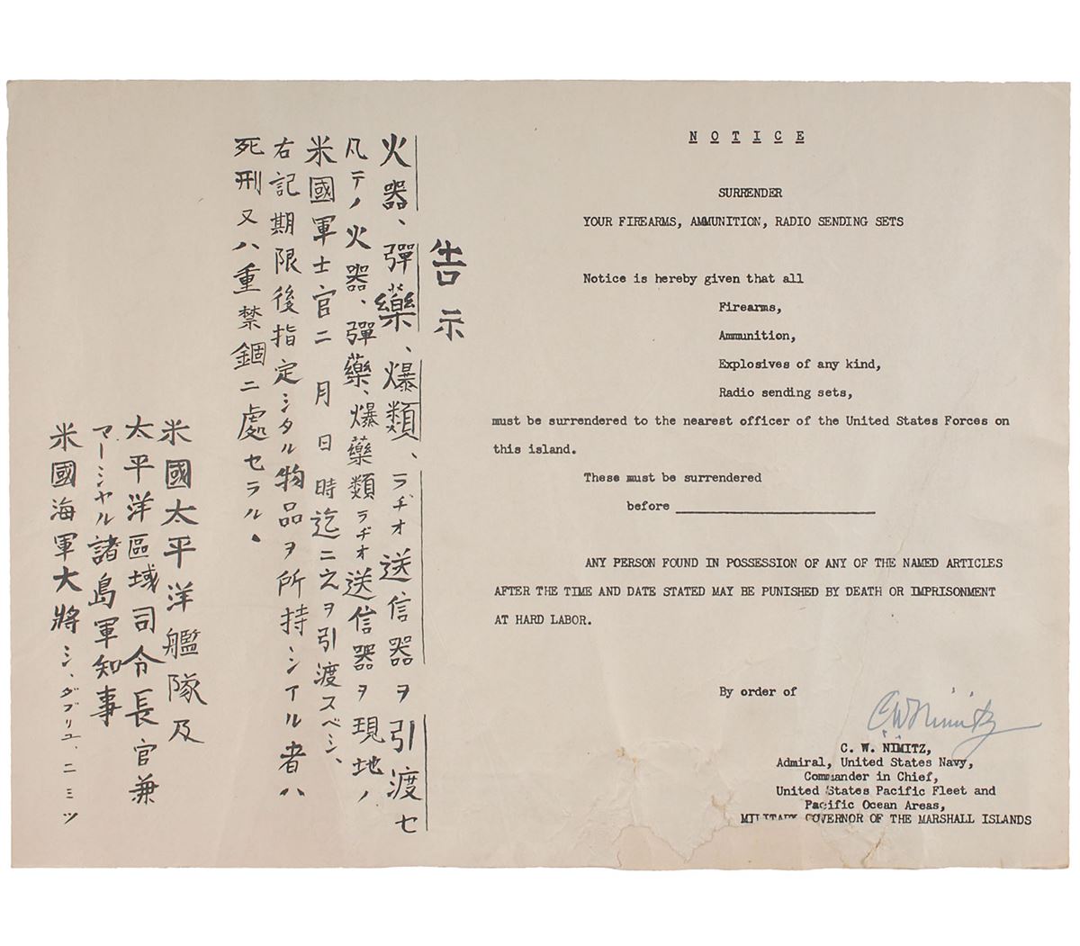 World War II–era printed notice in English and Japanese, signed “C. W. Nimitz,” one page, 12.5 x 9.25, no date. In part: “Surrender your firearms, ammunition, radio sending sets. Notice is hereby given that all Firearms, Ammunition, Explosives of any kind, Radio sending sets, must be surrendered to the nearest officer of the United States Forces on this island.” Tightly rolled and in very good condition, with a large repaired diagonal tear passing to the left of the signature, repaired tears and paper loss to the lower right, and scattered creases.