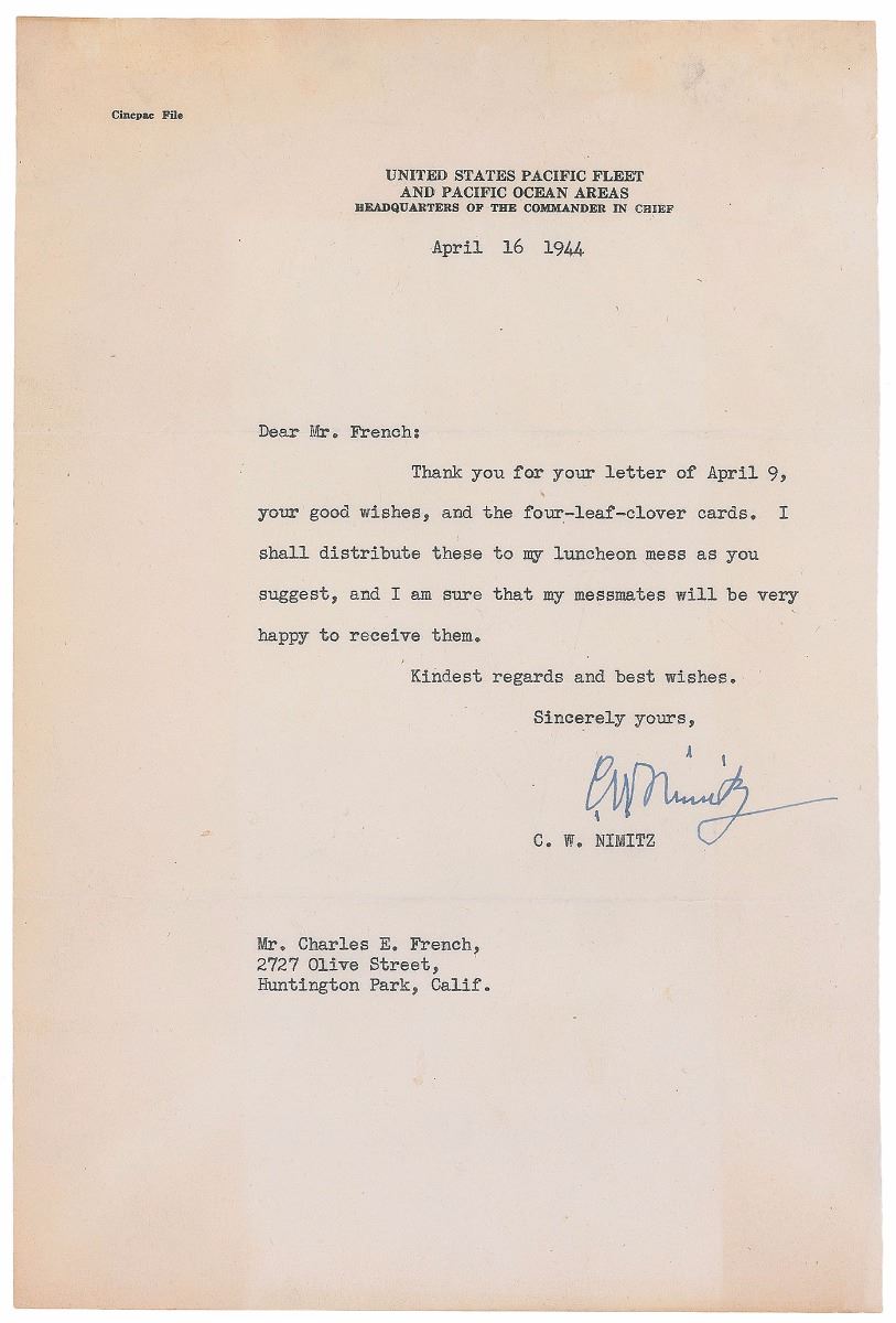 World War II-dated TLS signed “C. W. Nimitz,” one page, 7 x 10.5, United States Pacific Fleet and Pacific Ocean Areas letterhead, April 16, 1944. Letter to Charles E. French, in full: “Thank you for your letter of April 9, your good wishes, and the four-leaf-clover cards. I shall distribute these to my luncheon mess as you suggest, and I am sure that my messmates will be very happy to receive them.” In fine condition, with light toning and wrinkling to upper portion due to slight adhesive remnants to reverse.