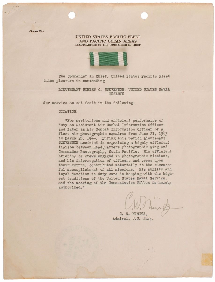 DS, signed “C. W. Nimitz,” one page, 8 x 10.5, no date. Official commendation certificate for Lieutenant Robert C. Stevenson, US Naval Reserve, recognizing him for “meritorious and efficient performance of duty as Assistant Air Combat Information Officer and later as Air Combat Information Officer of a fleet air photographic squadron from June 21, 1943 to March 23, 1944.” The green and white commendation ribbon is pinned to the top. In very good condition, with toning and dampstaining to top and bottom edges, a toned tape remnant to the lower right corner, and several tack and staple holes to the upper left.