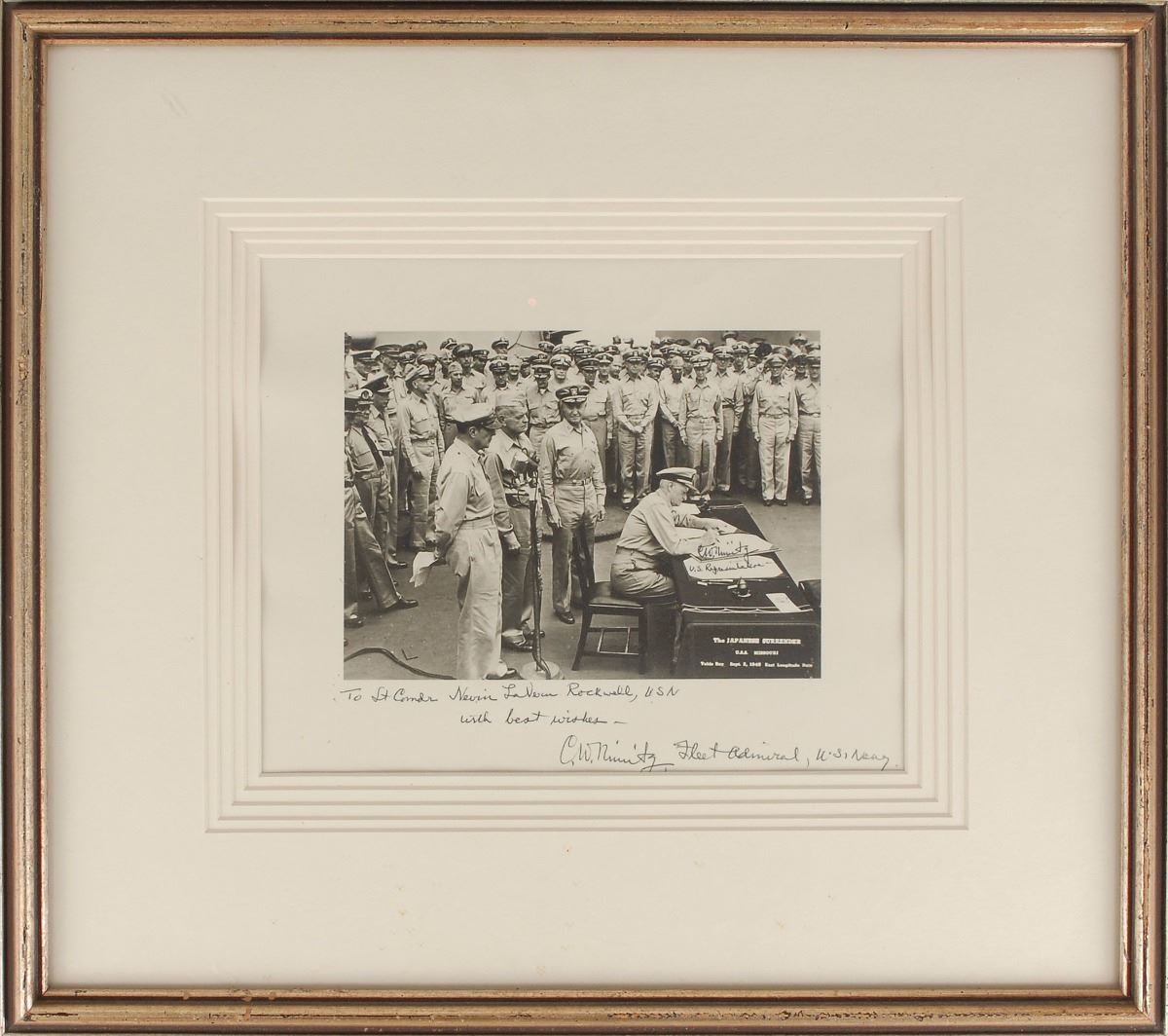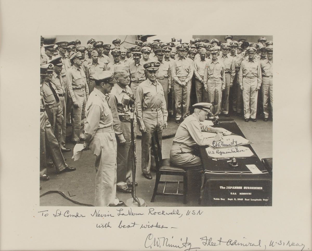Outstanding matte-finish 11.25 x 9.25 photo of Nimitz signing the Japanese surrender aboard the USS Missouri, signed and inscribed in the lower border in black ballpoint, “To Lt. Comdr. Nevin LaVern Rockwell, USN, with best wishes—C. W. Nimitz, Fleet Admiral, U.S. Navy,” and also signed on the image in the treaty area, “C. W. Nimitz, U.S. Representative.” Impressively matted and framed. In fine condition.
