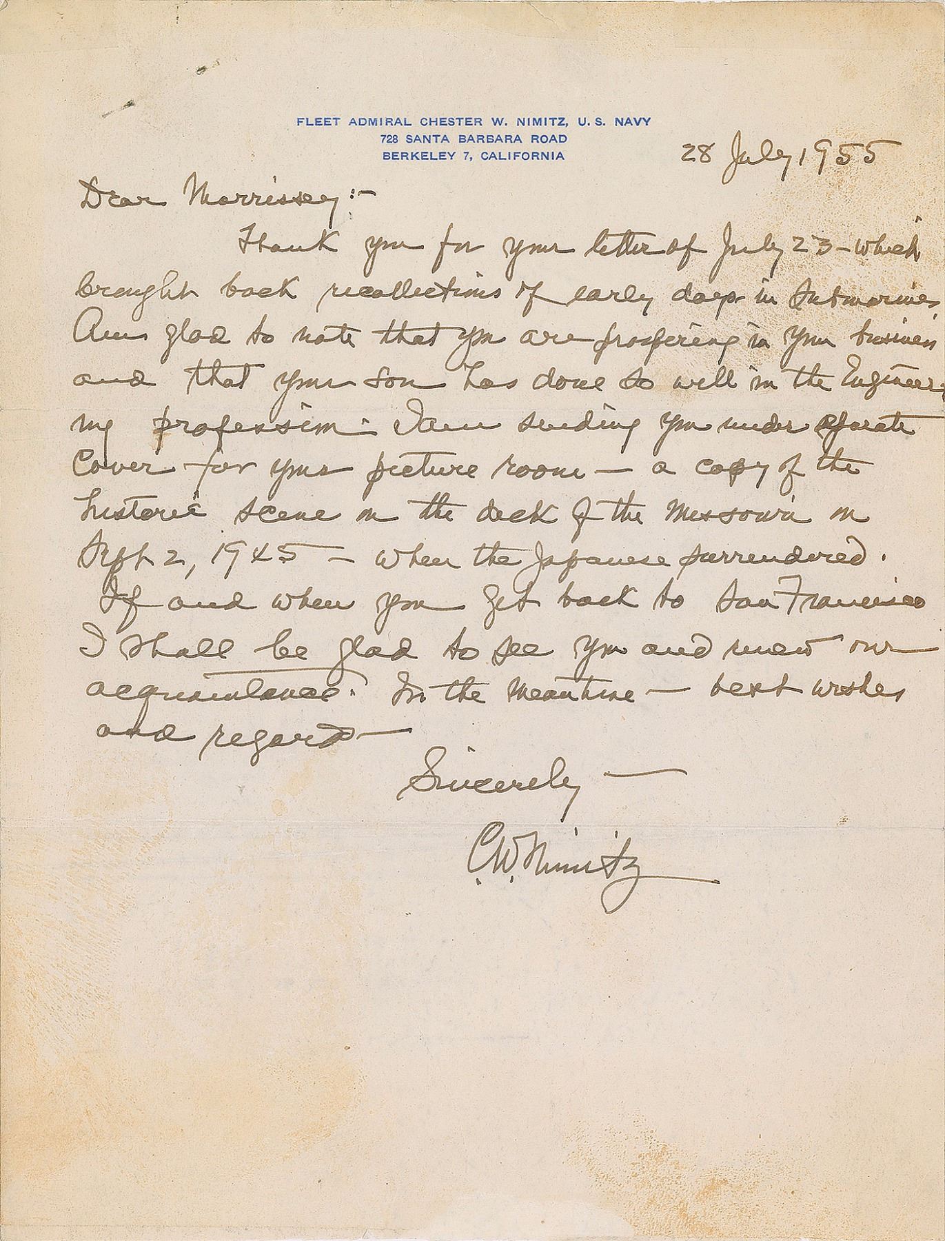 ALS signed “C. W. Nimitz,” one page, 8 x 10.5, personal letterhead, July 28, 1955. Letter to "Morrissey," in part: "Am glad to note that you are prospering in your business and that your son has done so well in the Engineers, my profession. I am sending you…a copy of the historic scene on the deck of the Missouri on Sept. 2, 1945—when the Japanese surrendered. If and when you get back to San Francisco I shall be glad to see you." In very good condition, with scattered soiling, light toning and creasing, pinholes to upper left, and pieces of clear tape at the top and bottom edges.