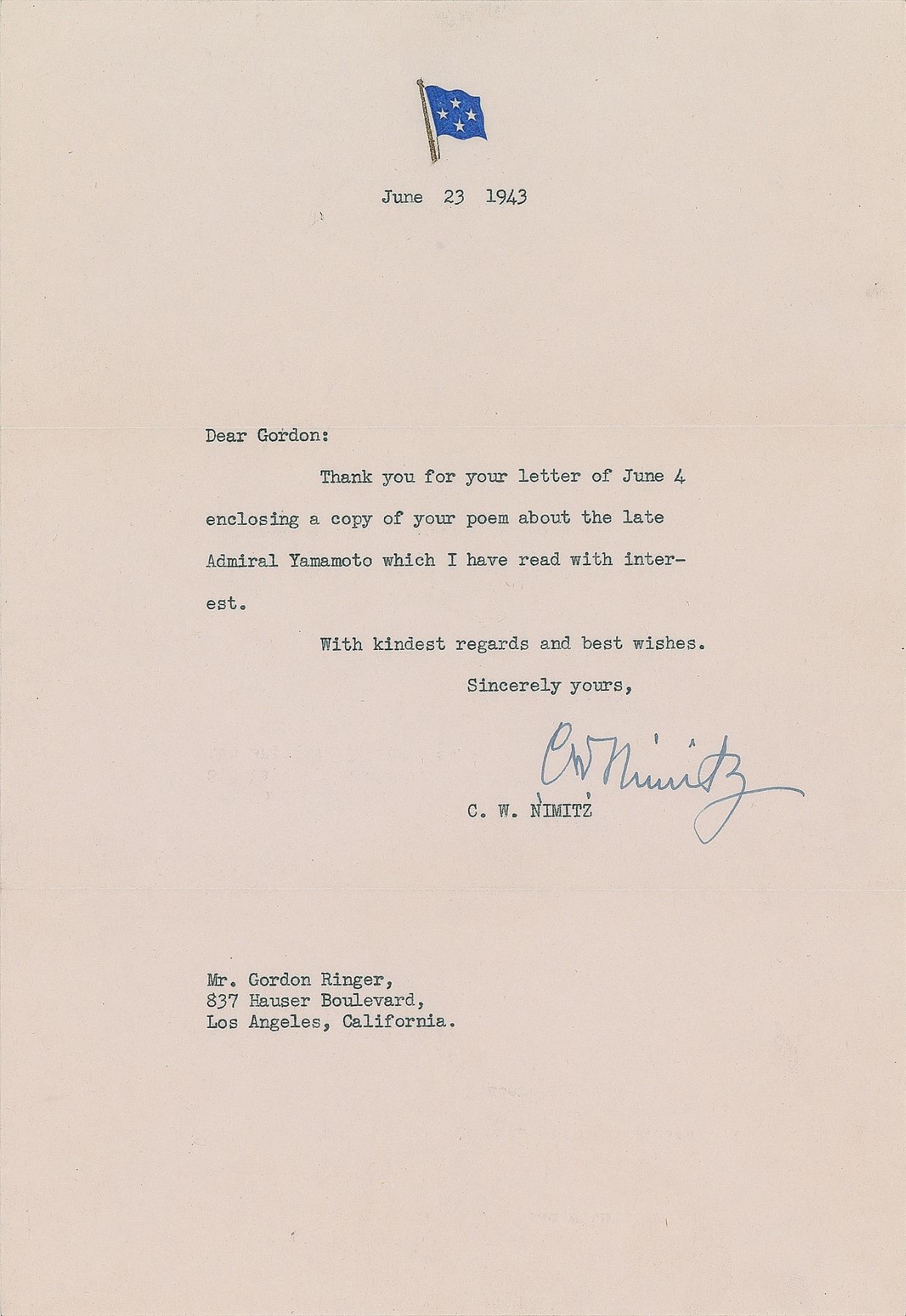 TLS signed “C. W. Nimitz,” one page, 7.25 x 10.5, four-star admiral letterhead, June 23, 1943. Letter to Gordon Ringer, in full: "Thank you for your letter of June 4 enclosing a copy of your poem about the late Admiral Yamamoto which I have read with interest." In fine condition. Accompanied by the original mailing envelope and a clipping of Ringer's poem, 'I, Yamamoto.' Yamamoto, the mastermind of the Japanese attack on Pearl Harbor, had been killed in action in April 1943.