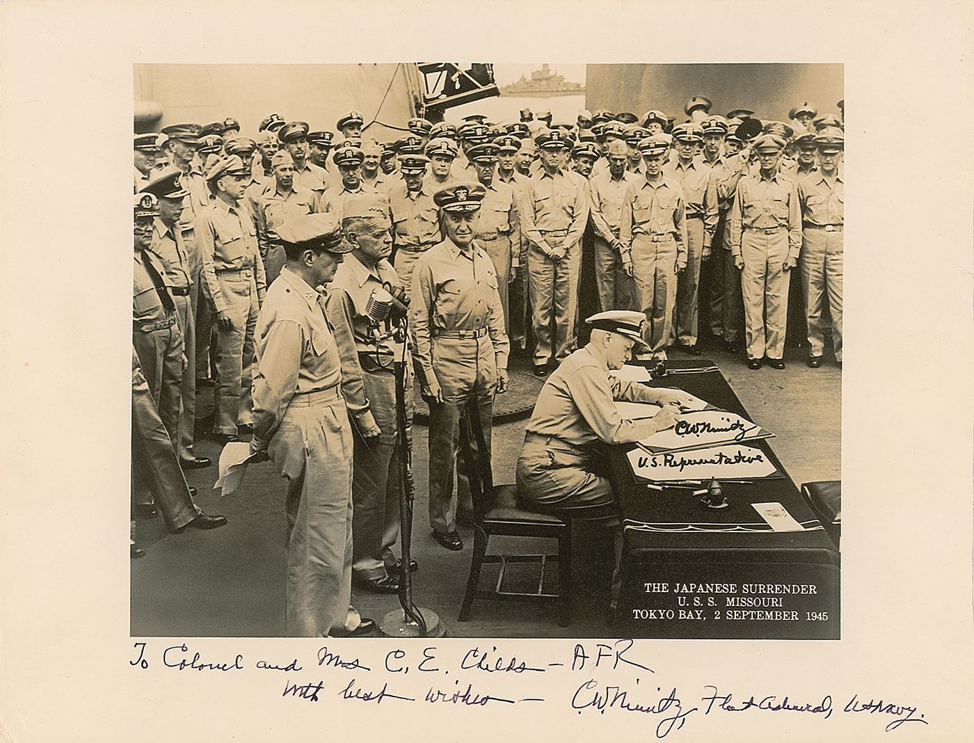 Vintage matte-finish 13.75 x 10.5 photo of Nimitz signing the Japanese surrender aboard the USS Missouri, signed and inscribed in black ink, "To Colonel and Mrs. C. E. Childs—AFR, with best wishes—C. W. Nimitz, Fleet Admiral, US Navy." In very good condition, with mild rippling, mainly to borders, some light corner creases, and some scattered irregular ink adhesion to signature and inscription.